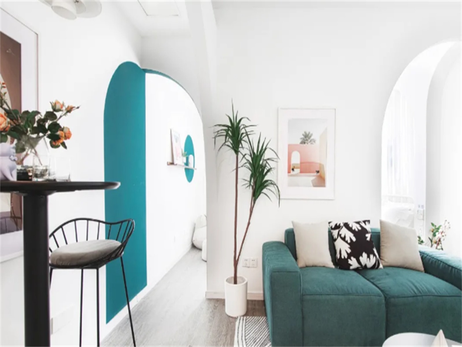 从客厅望向卧室,其拱形门的元素连贯而重叠,层次丰富