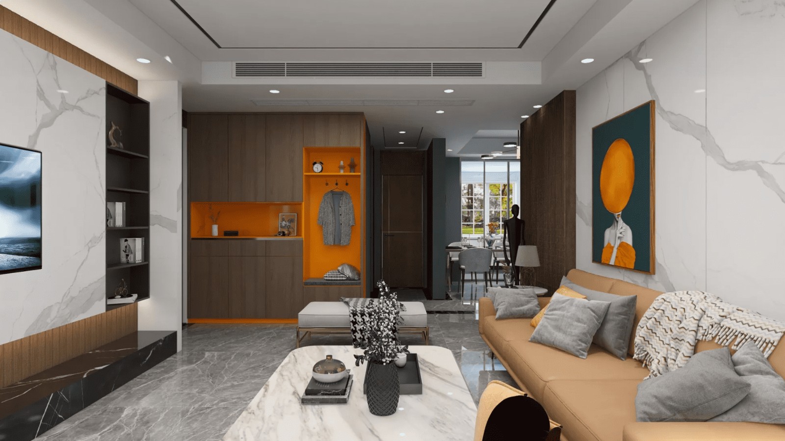 步入室内,明亮开阔的客厅空间跃入眼帘。灰咖色木格栅的紧凑感和浅色纹理岩板,构成了张弛有度的设计效果