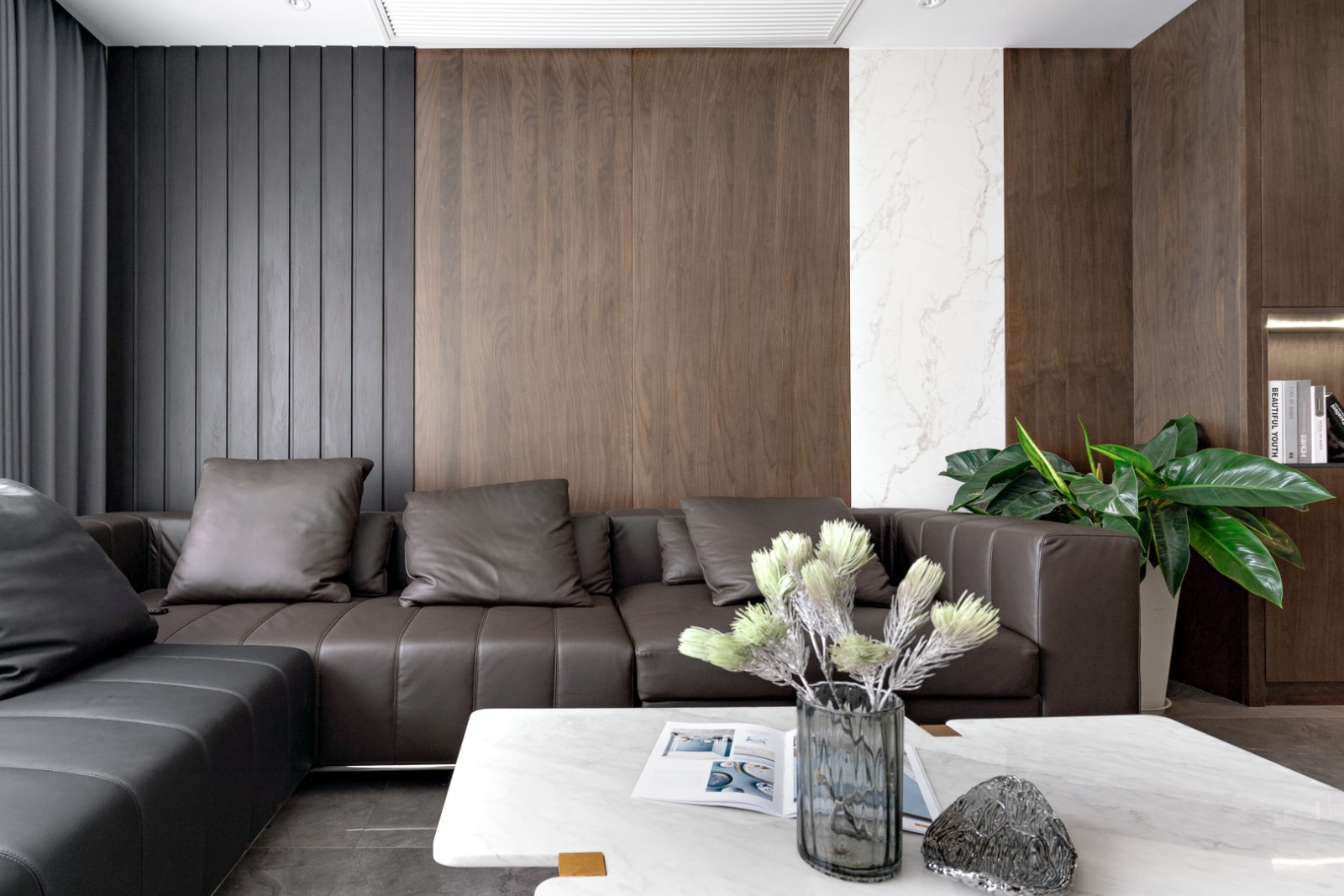 沙发背景墙以黑、木、白的“三拼色”呈现,原木的温醇和大理石的清冽彼此碰撞中和,深浅合一,冷暖交融,凝练出现代简约风格的生活质感。