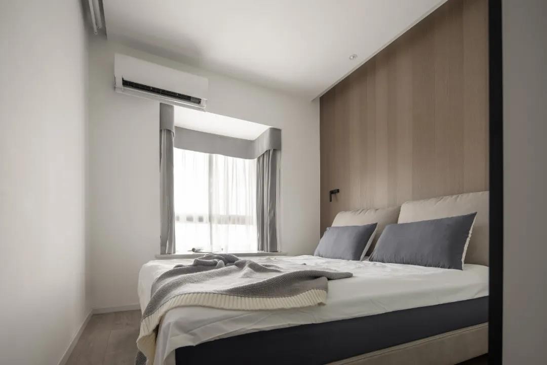 卧室简洁的空间把天花做成吊平顶的设计,加入筒灯与灯带,并在床尾上方天花加入电动幕布,为主人提供了一个方便实用、娱乐功能强大的卧室空间。床头墙以木饰面为背景,布置卡其色的床铺,布置洁白的床单、灰色的枕头,也让空间显得简洁优雅而舒适。