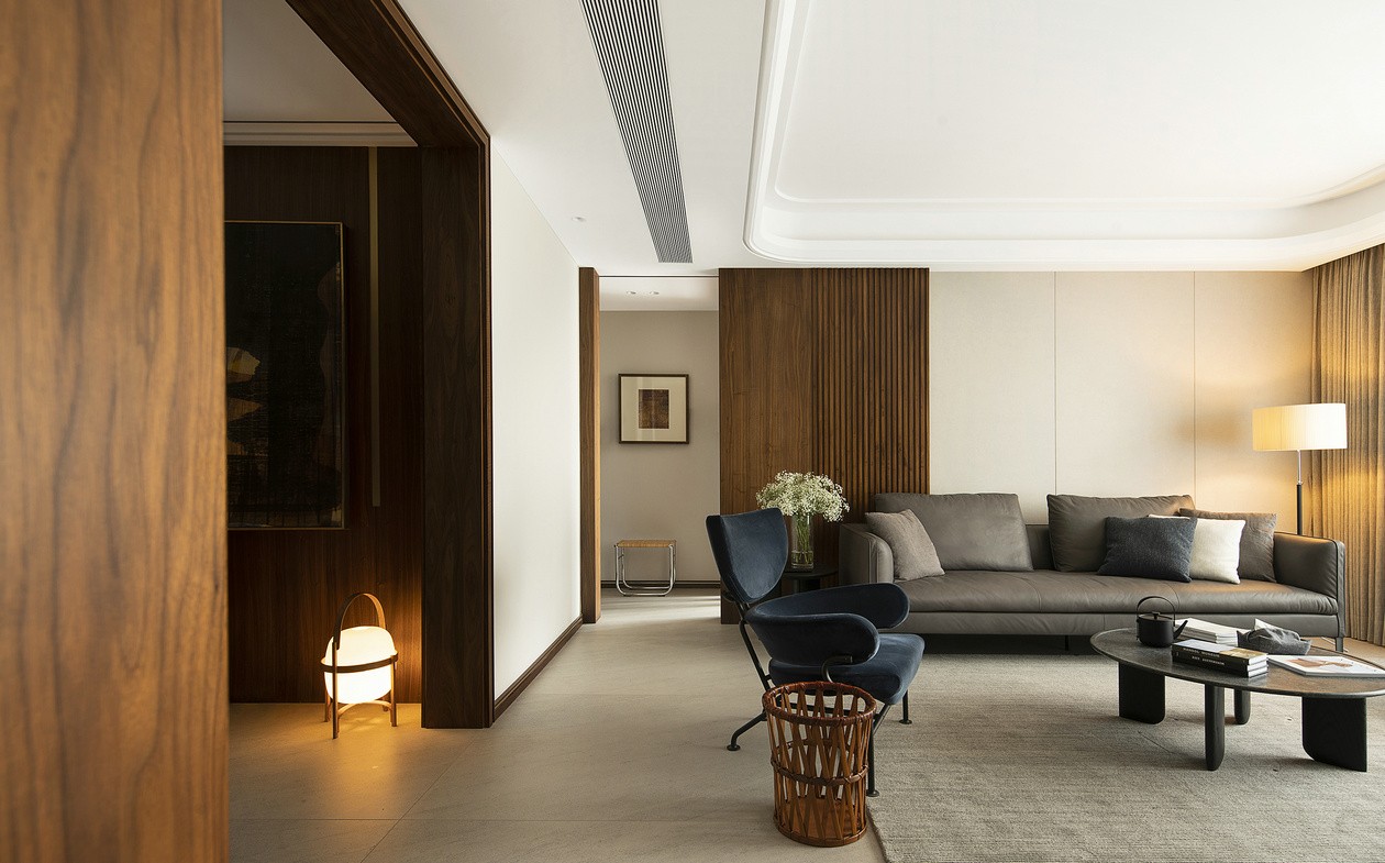 客厅采用米白色木饰面搭配木色格栅,衬托出业主的个性!