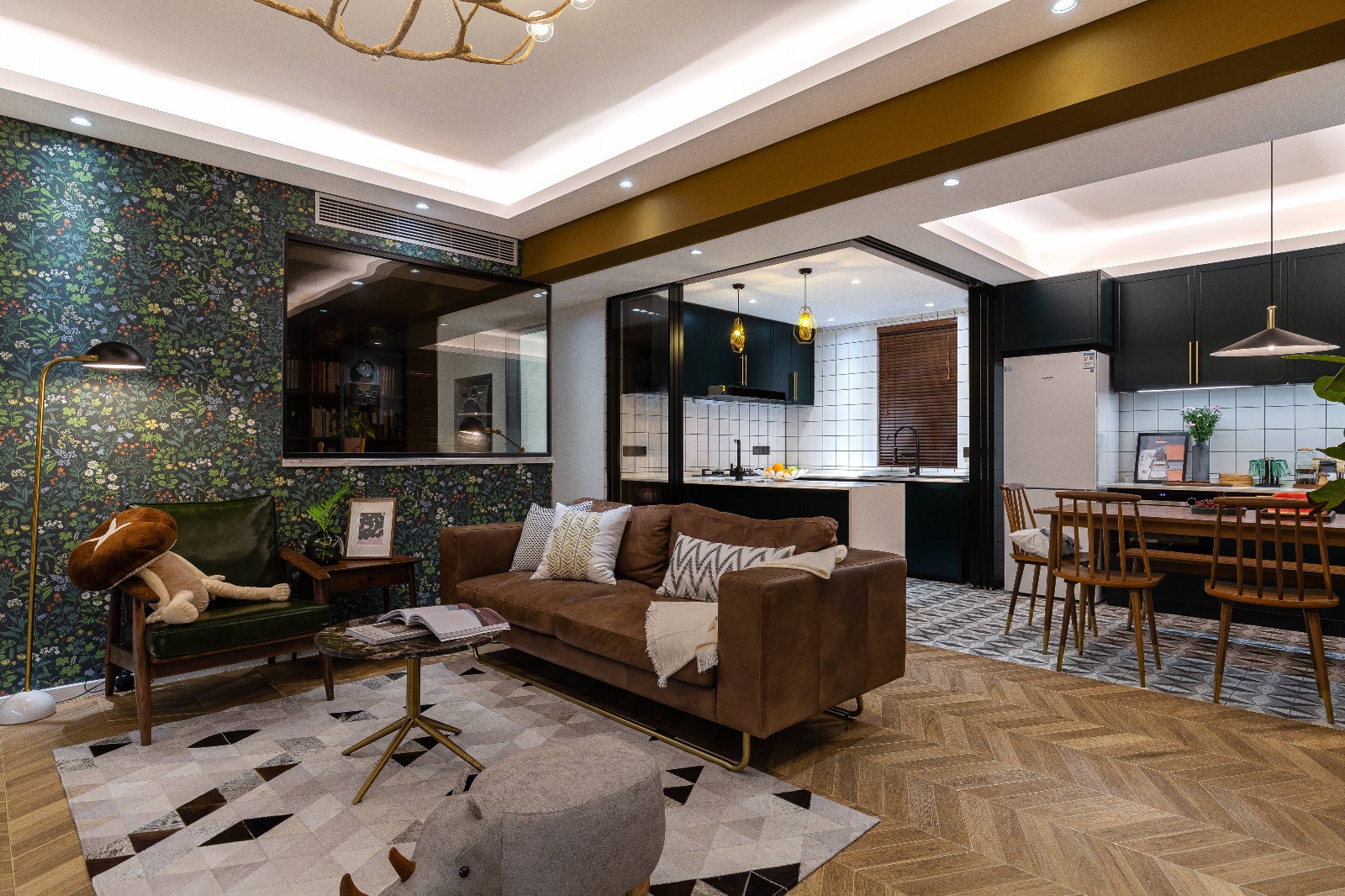 打通原始户型中厨房的墙体,采用开放式厨房的设计,用黑色边框的玻璃折叠移门分隔厨房与餐厅,不遮挡光线,同时联系了客餐厅,方便客餐厅之间的沟通,一举两得。烹饪时可玻璃门关上,隔绝油烟。