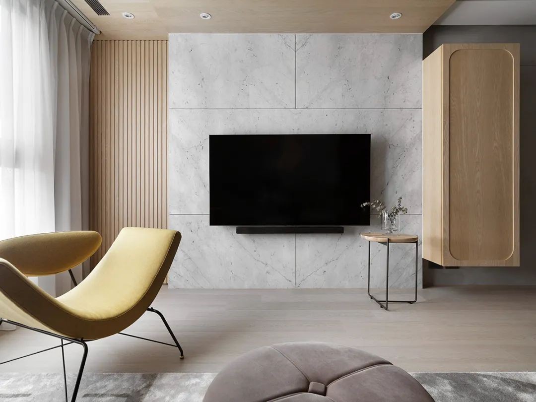 云雾纹理的大理石搭配橡木格栅