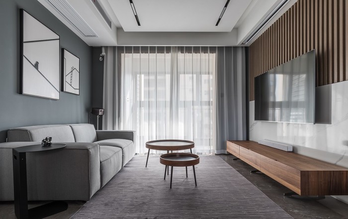 松软的双人沙发和坚硬的格栅电视墙也就此形成对比,让整个空间丰富且有序。