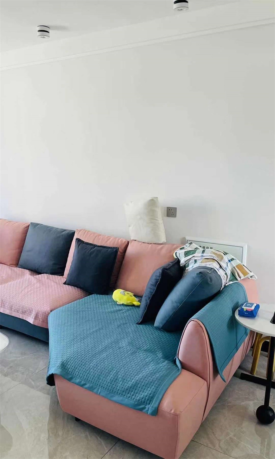 客厅浅灰色沙发配合浅灰色的墙面,点缀蓝灰色小样配合蓝灰色窗帘,白色小几跟随大件白色茶几,使整个空间充满生气但不凌乱