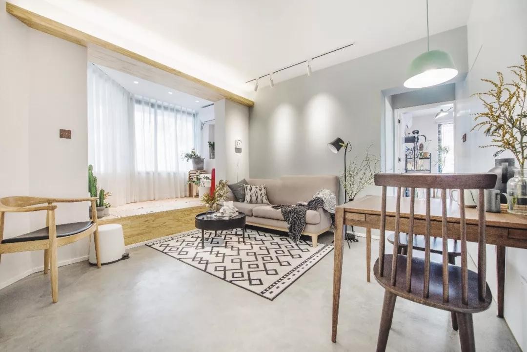 客餐厅就在玄关的边上,客厅内有一个弧形的窗户,被改造成了飘窗地台,在这里躺着看书、晒太阳,可是非常惬意的事情。