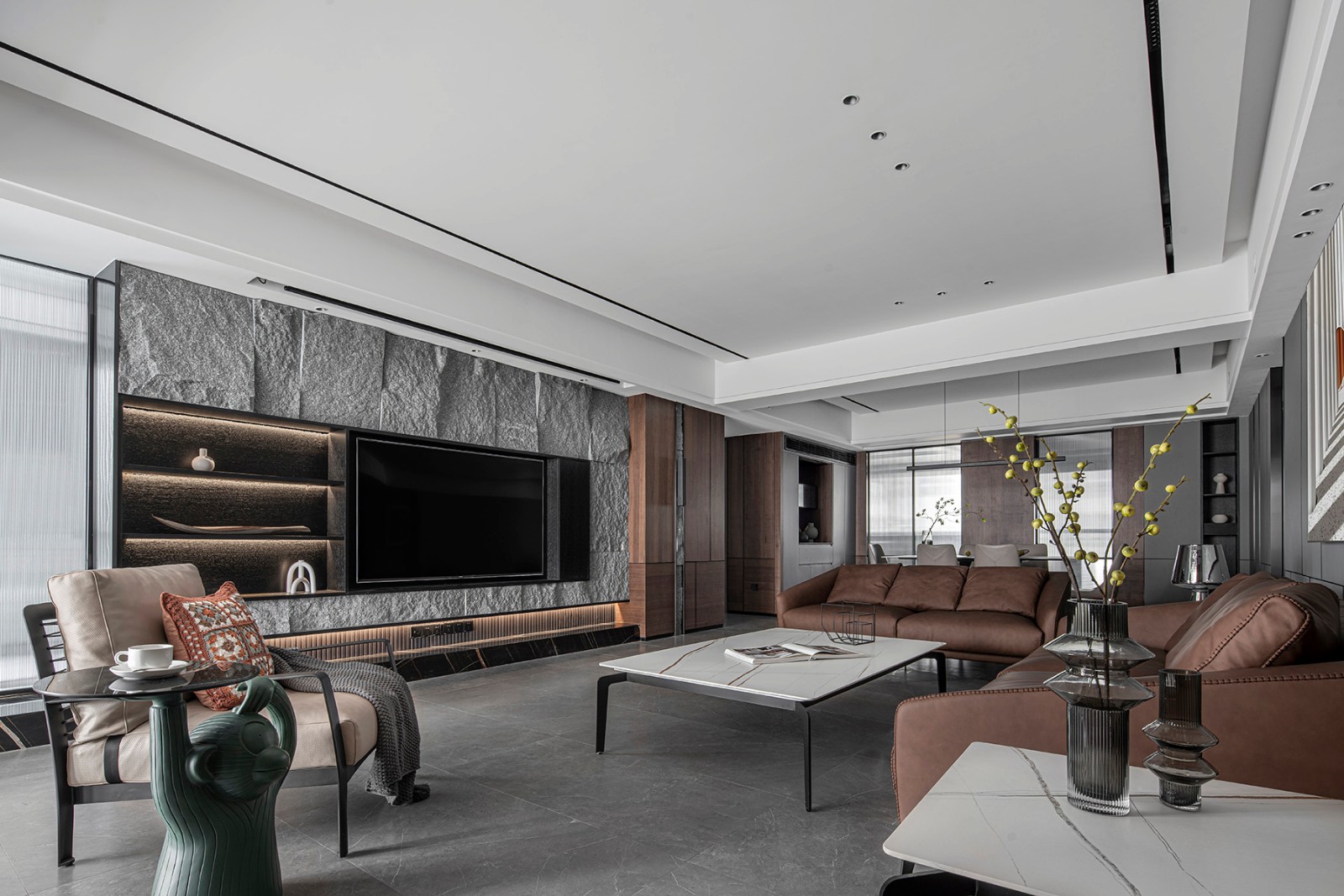 整面的电视墙是本案点睛之笔,设计师大胆采用了叠石的铺设,让那些留有时间印记的灰色自然面石皮,带着凹凸的质感和厚重的气息,顺着石材的肌理层层蔓延开,又碰撞到胡桃色的木纹质感之上。霎时,幽而静的姿态扑面而来,将人包裹住,却把心灵放飞徜徉在山川与古树之间。