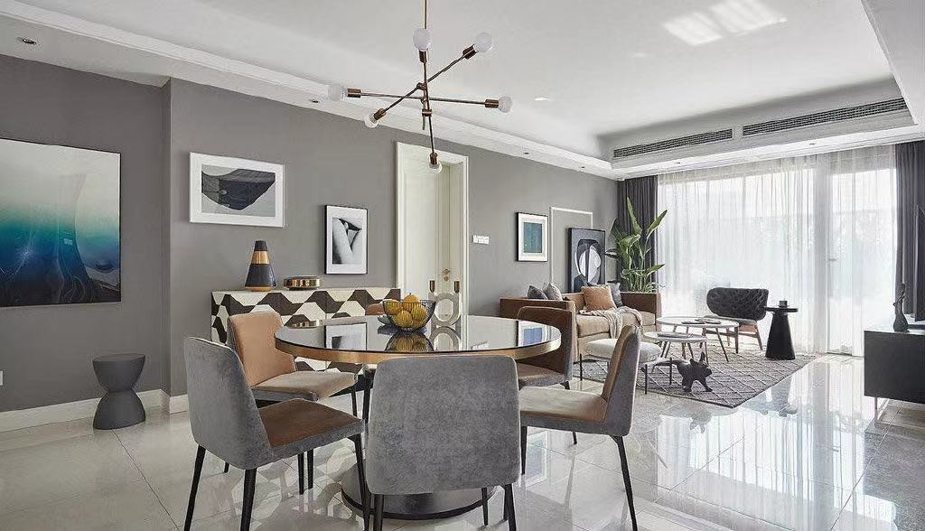 这套方案和客户沟通下来采取的是轻硬装重软装的方案。只在电视背景做了木饰面护墙板背景,其他的地方是刷的乳胶漆,靠我们后期软装来搭配出整体氛围效果,所以在后期的一个软装选择上和客户这边话费了很多心思,也做了一些绿植来点缀,让整个家里更有生机,因为客户家的采光比较好,所以客厅的色调做了经久耐看的灰色,让客厅整体氛围显得更加有质感 后期搭配皮质沙发绒。