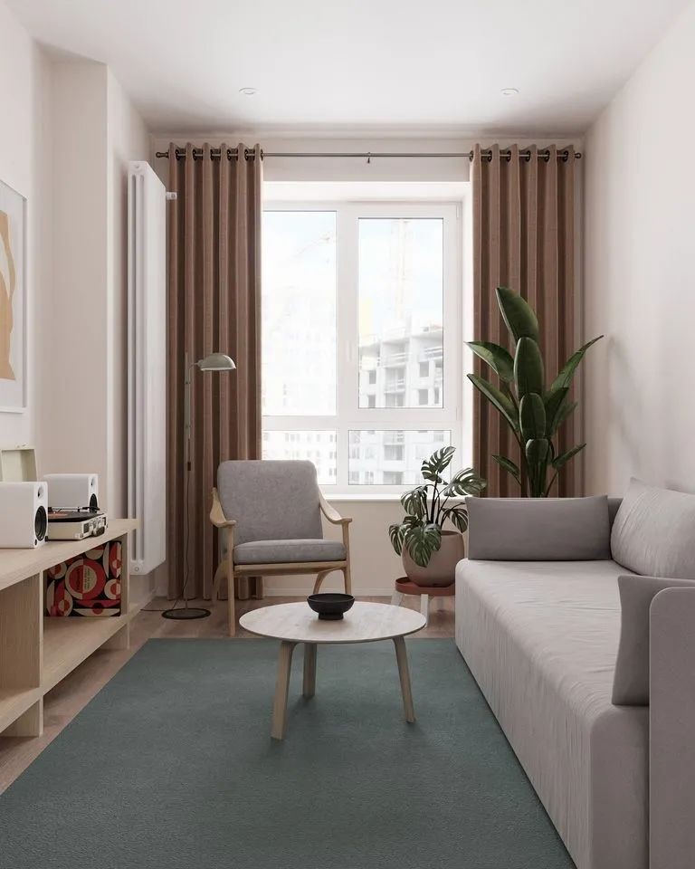 客厅空间狭长,靠窗的位置设置了休闲区浅灰色沙发靠墙摆放留出更多中间区域供人走动茶几、矮柜等木家具在墨绿色地毯的衬托下形成清新自然的感觉