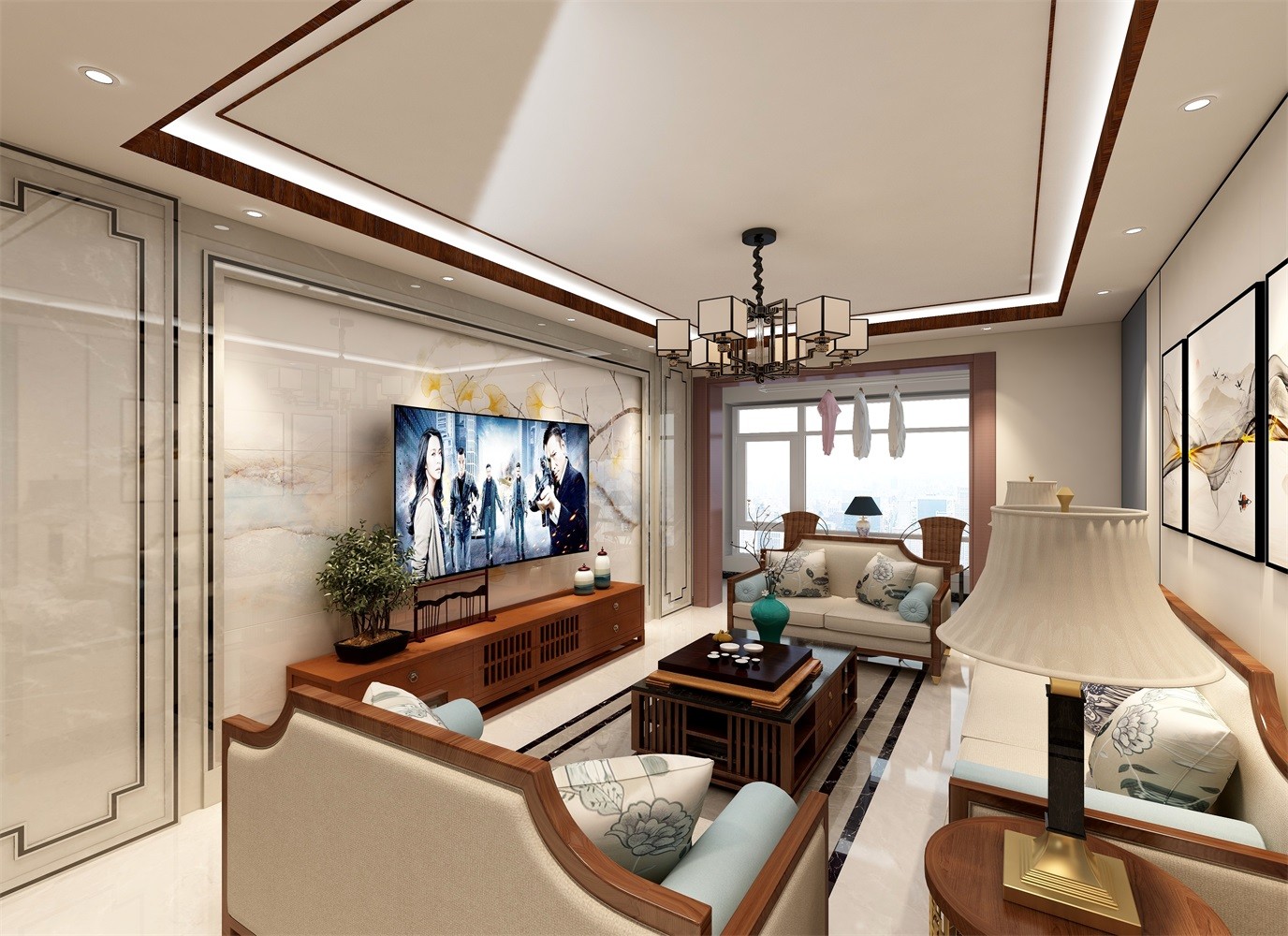 客厅以暖色为主,搭配原木中式软装, 吊顶米色顶配咖色线条,空间感十足,立体舒适。