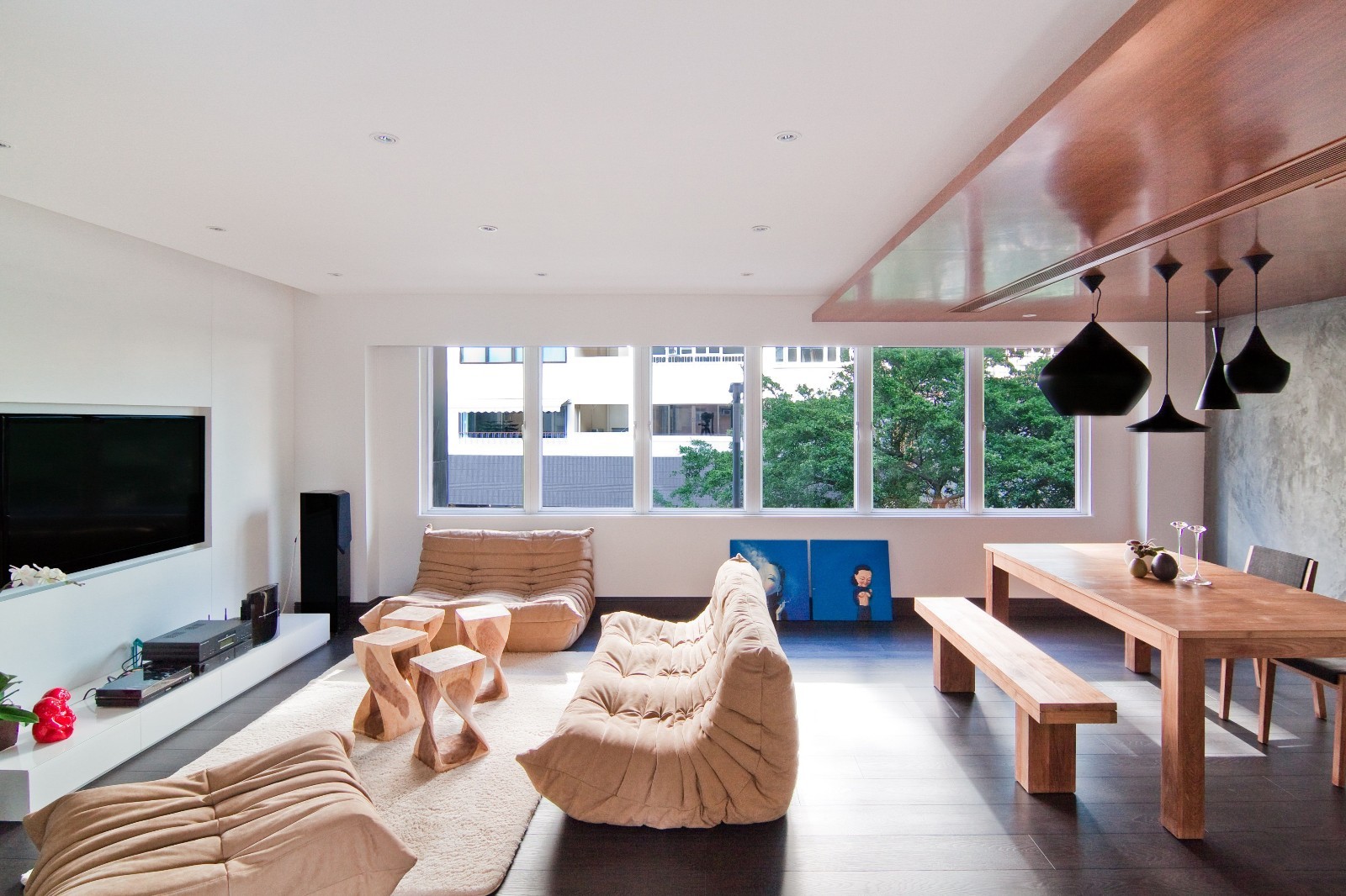整体家居的颜色上很富有层次感,再加上原木的高脚家具提升了客厅的整体质感