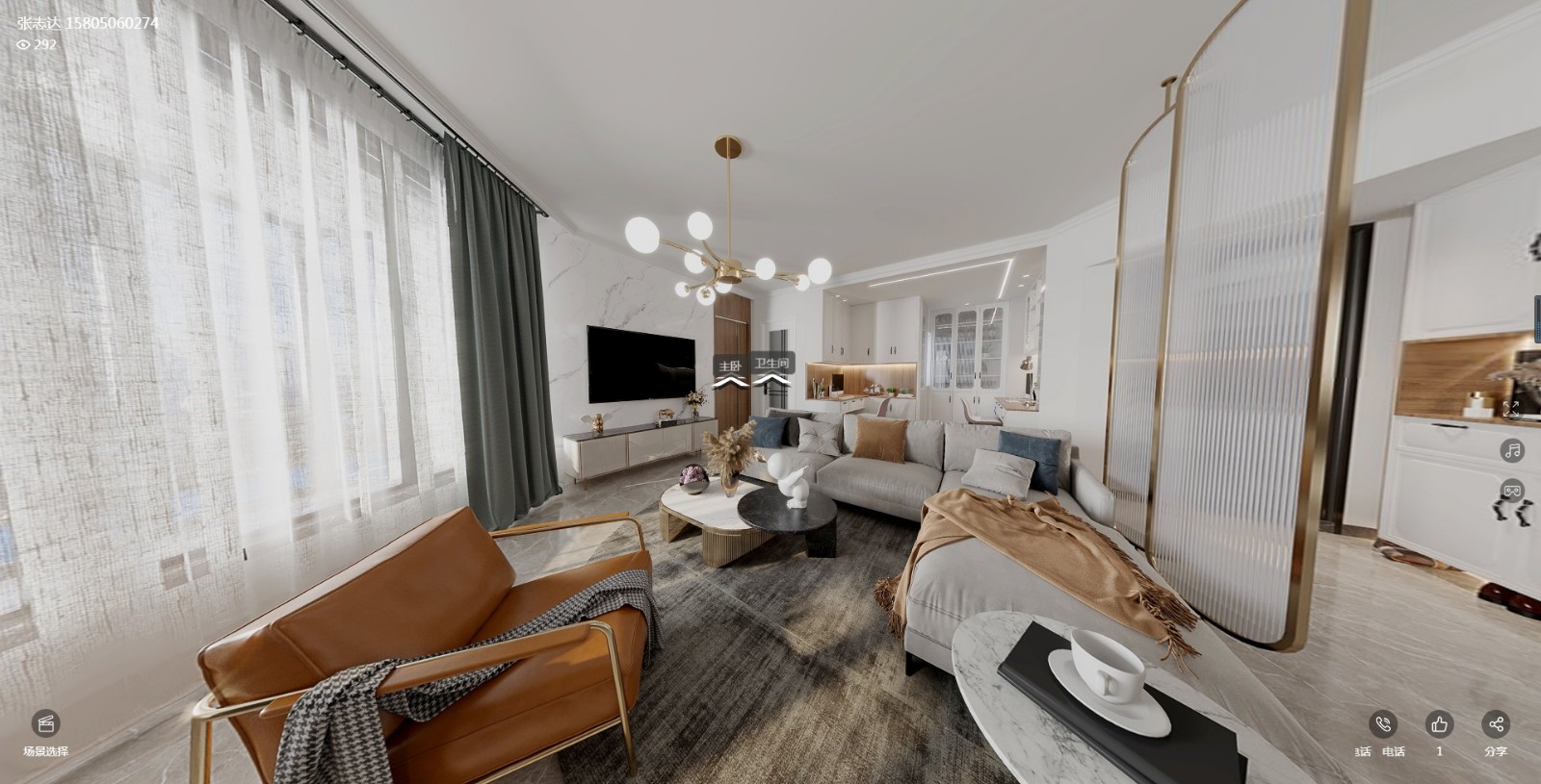 由于户型限制,沙发区选择做在了客厅的中心位置,做了环绕型动线,背后做了玻璃屏风作为“靠山”