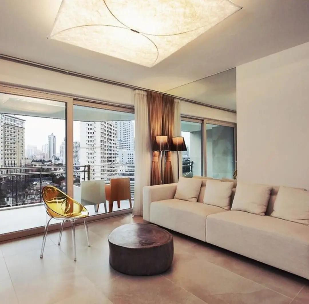 沙发墙同样使用到了镜面材质,虽说有一点奇怪,但也将室外的美景给拉到了眼前,从而让室内与室外有了一种共生共长的意境。
