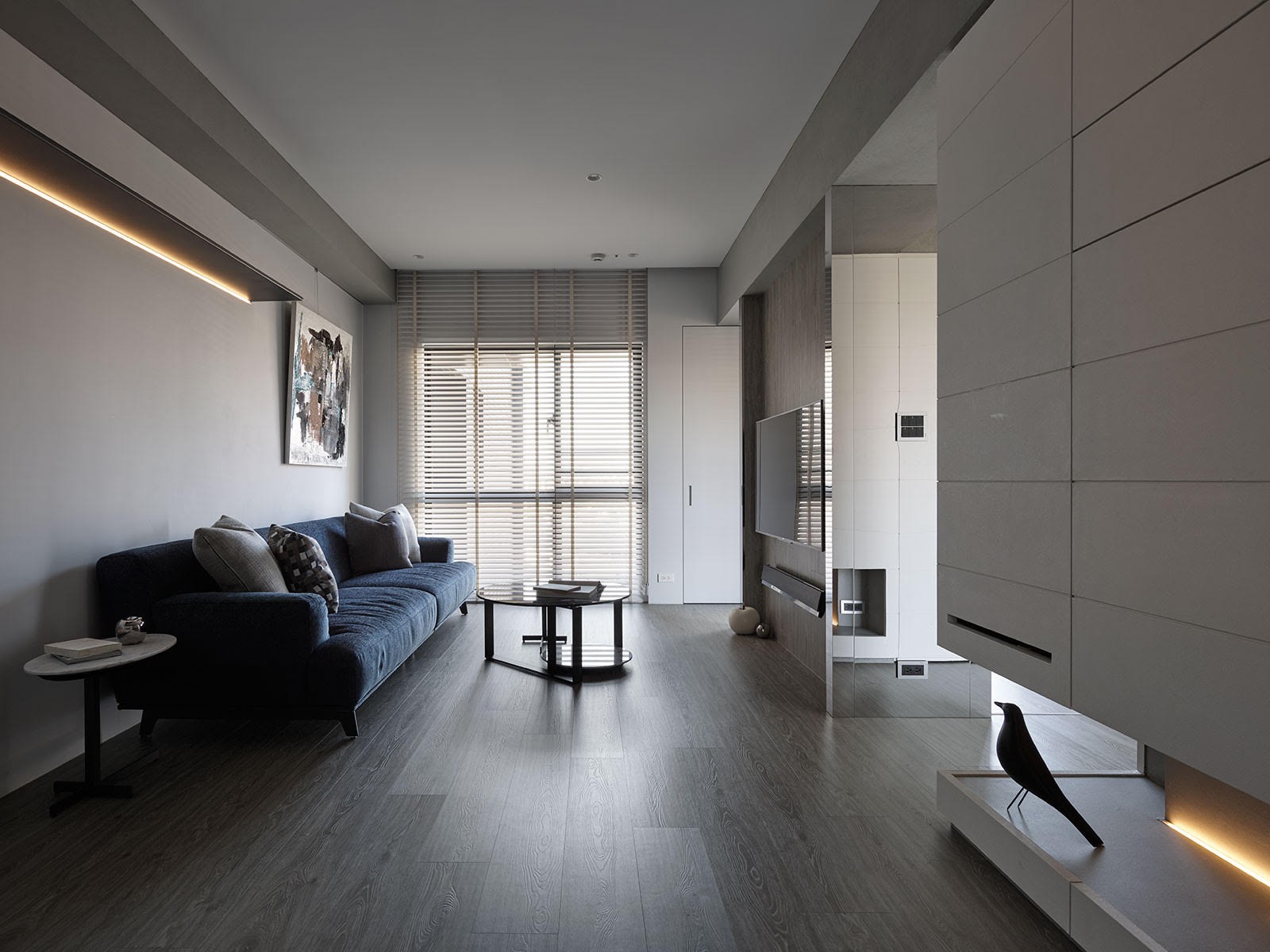 客厅的摆放的物件是非常少的,储物的设计是非常多的,白色的墙体全是储物的。