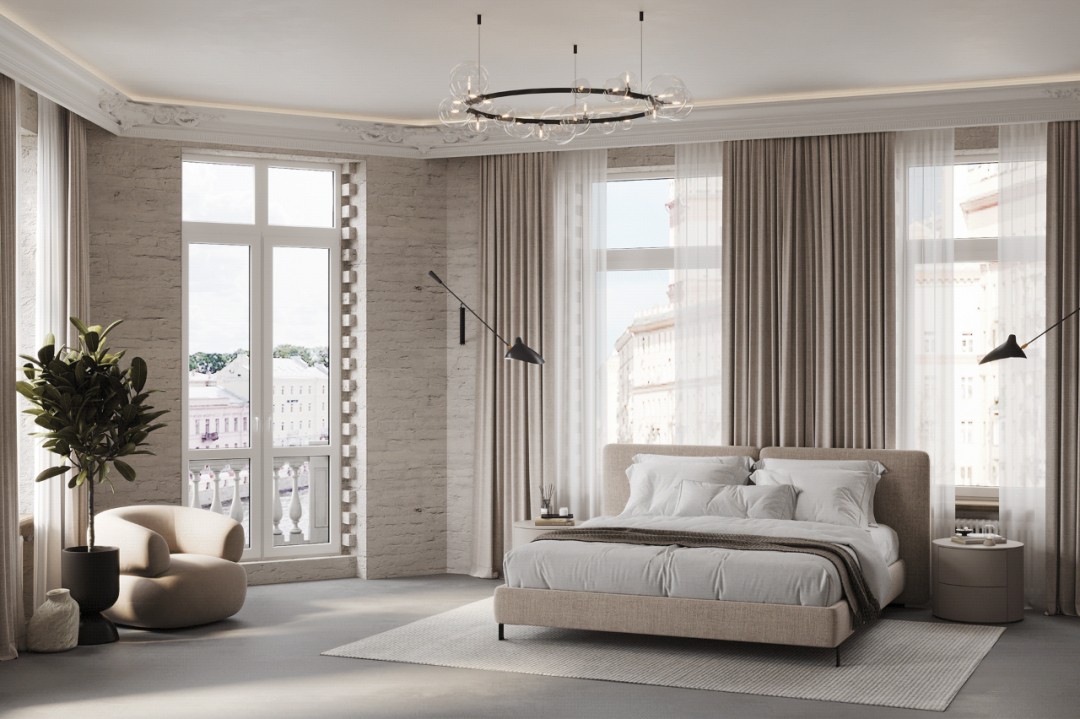 主卧依旧延续简洁优雅的轻奢风格,米灰色的砖面壁纸散发出优雅的气息,增添了整体空间的质感。