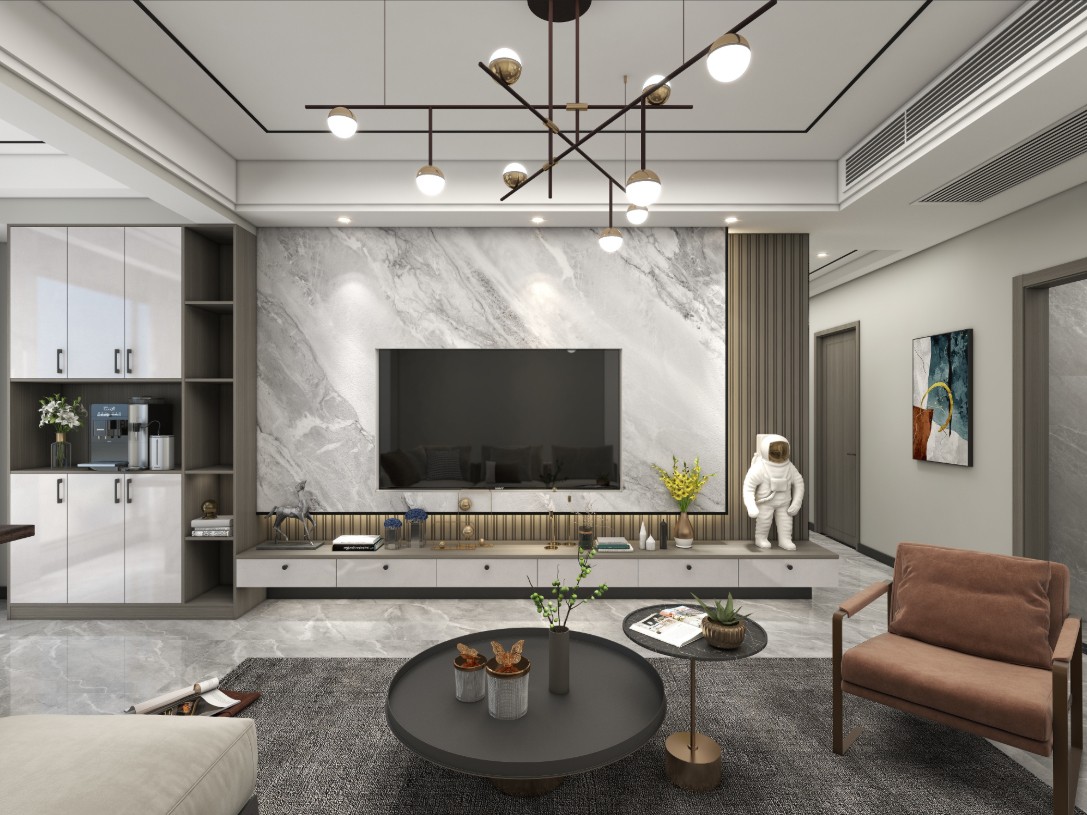 悬空的电视背景墙很好地平衡了进门视线的穿透性与私密性,同时下方的整排抽屉柜让镂空的台面得以保持整洁。