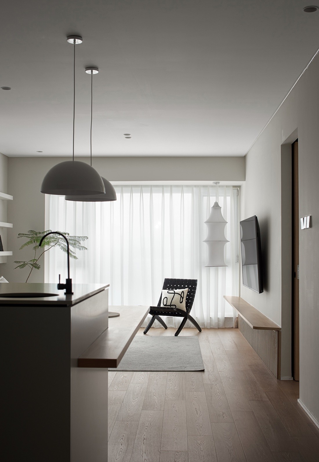 摒弃了传统电视柜,木栅格条+隔板的设计让空间更加通透轻盈。原木地板都向同一方向纵深,延伸了视觉空间,打造空间的流畅性。轻薄的纱帘肆意坠落,光与影跌宕起伏,增强了室内的纵深感。 现代风,客厅 ,木地板 ,木格栅