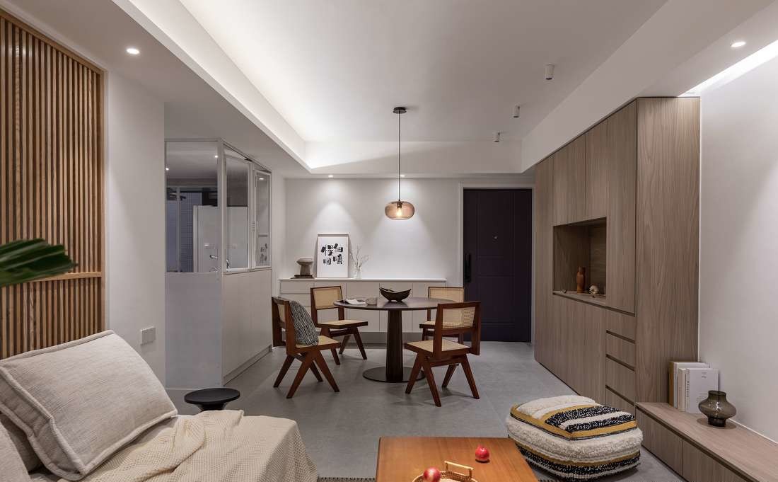 入户后LDK格局映入眼帘,考虑到动线灵活性,我们在餐厅软装上选择了二黑木作的胡桃木圆桌配合藤编椅作为生活的开场白,意为“团圆与相聚”,搭配一组L型白色餐边柜配合就餐人的生活习惯。
