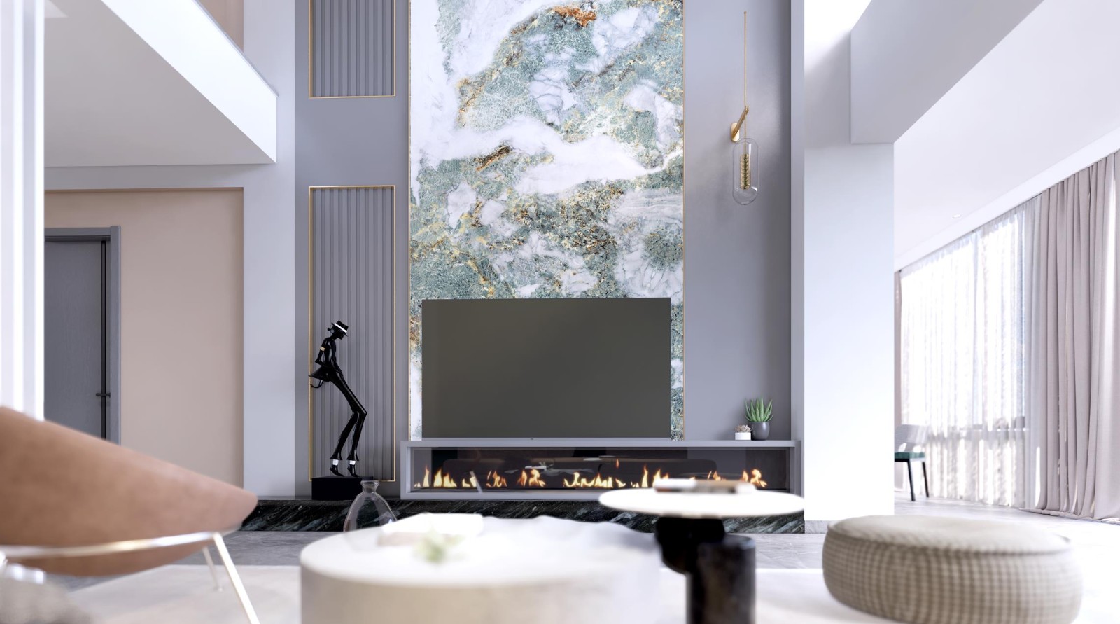 岩板装饰的电视背景墙是客厅一大亮点,利用中间色的护墙板,岩板宽度始终高度通顶,格局分界,保留空间宽适度,切割出比例得宜的空间尺度,同时也让客厅与其他空间连通起来。