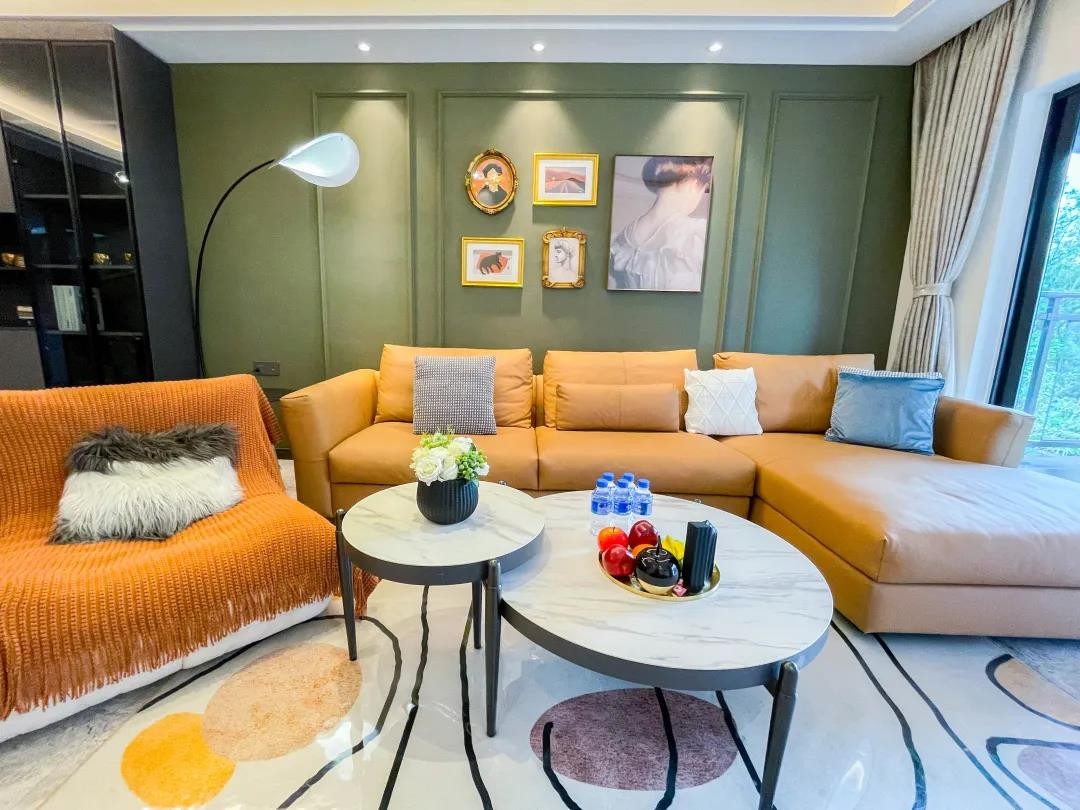 客厅墙体采用莫兰迪绿为主,橘黄色沙发与墙体形成鲜明对比,更具空间感。浅色系木质家具搭配落地灯,在简约的同时,不失华丽,让人感觉温馨舒适。