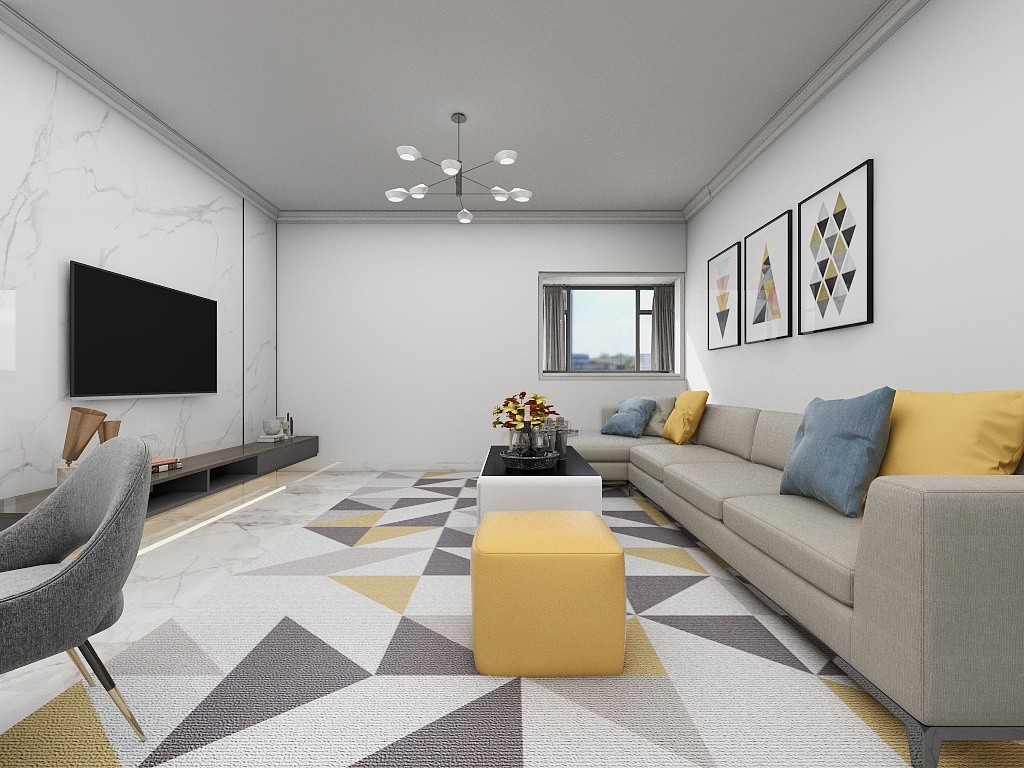 地面铺白色大理石增加客餐厅的明亮度,沙发用软质布料,布艺床搭配柔软亲肤的床品,枕头色彩使室内空间显得和谐、有层次感