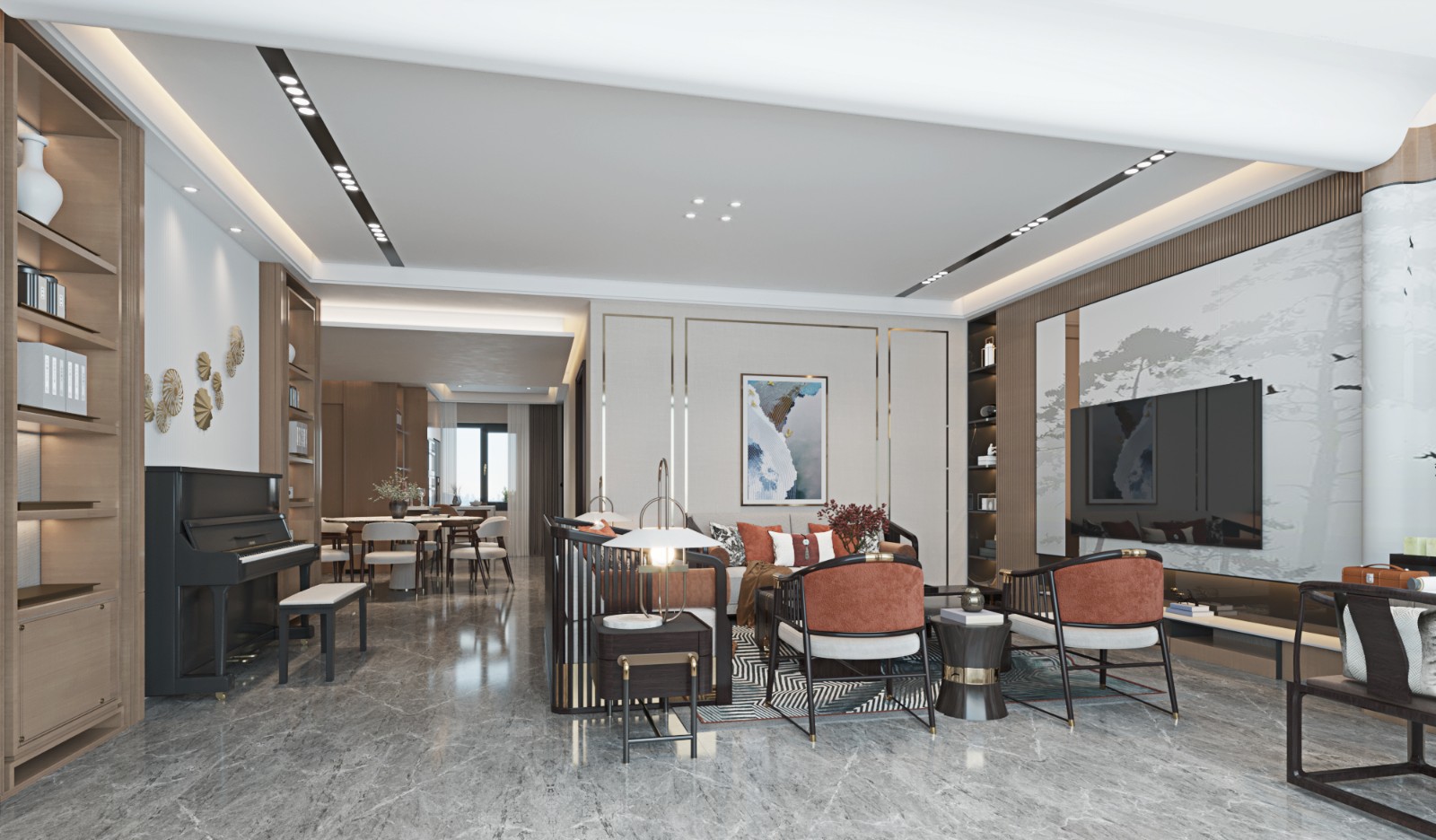 客厅在硬装上以大理石、原木色为主,以金属边框修饰,沙发的橘红色成为了客厅的视觉亮点,造型与摆放参考了新中式的风格,让这精致时尚的现代家居也带上了些许东方文艺的气息。