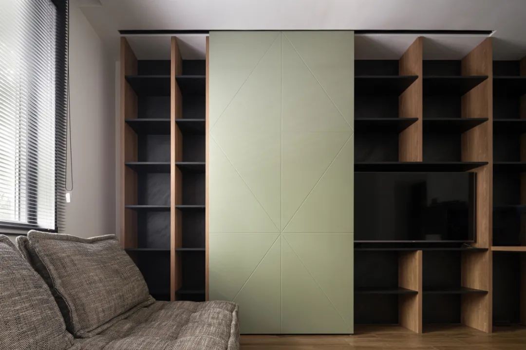 客厅打破原有固定的设计,在电视墙做了吊轨的滑门设计,平时电视隐藏起来,弱化了电视的存在,对于营造安静的学习环境很有帮助。