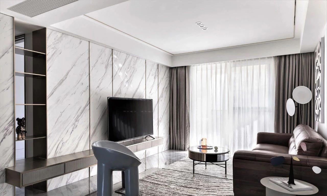 客厅搭配了沙发和茶几,简约电视柜,既可储物也可展示,美观实用。