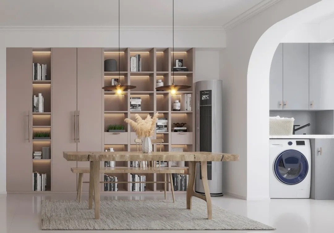 客厅摒弃了常规的沙发+茶几+电视组合,打造家庭亲子空间,集阅读、休闲、会客、办公为一体,使空间多样化发展。