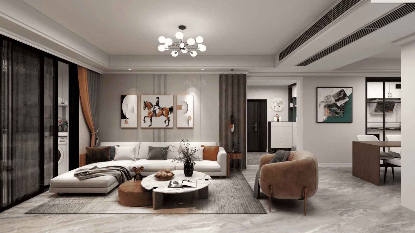 现代风格是当下主流的装修风格,当把轻奢风的设计元素融入到现代大方的客厅里,带来的就是一种优雅端庄而又舒适的华丽,体现出主人不凡脱俗的儒雅气质。