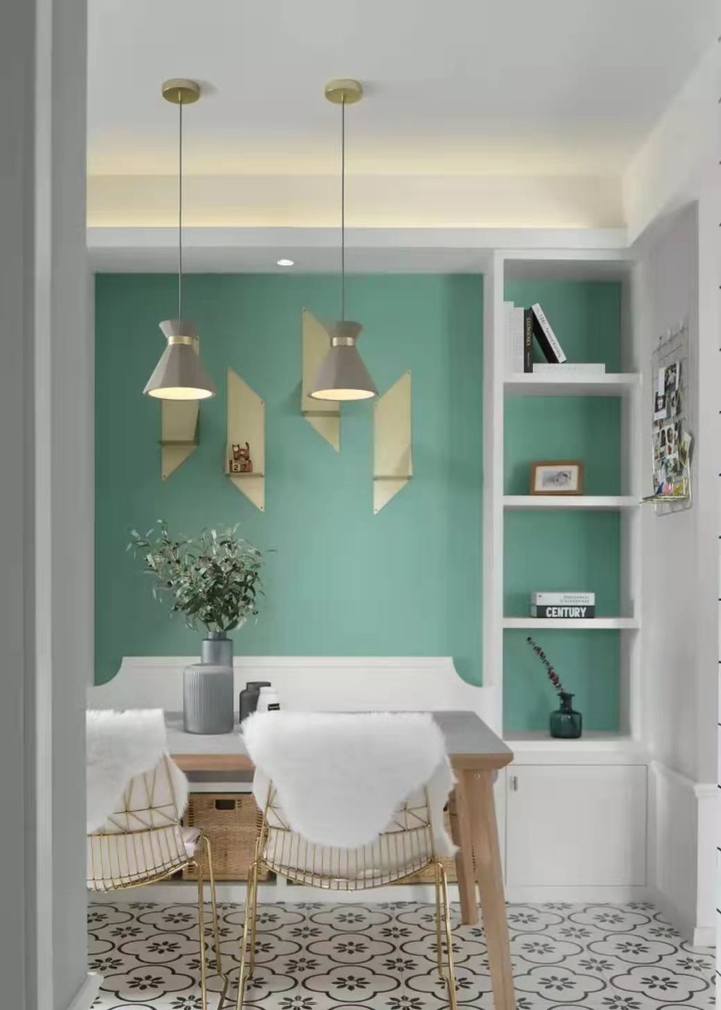 餐厅背景墙依旧选用了屋主中意的绿色,在白色定制卡座的映衬下,更显清爽舒缓。卡座的形式,能够满足多人用餐并且具有收纳功能,同时又不失空间上的设计美感。