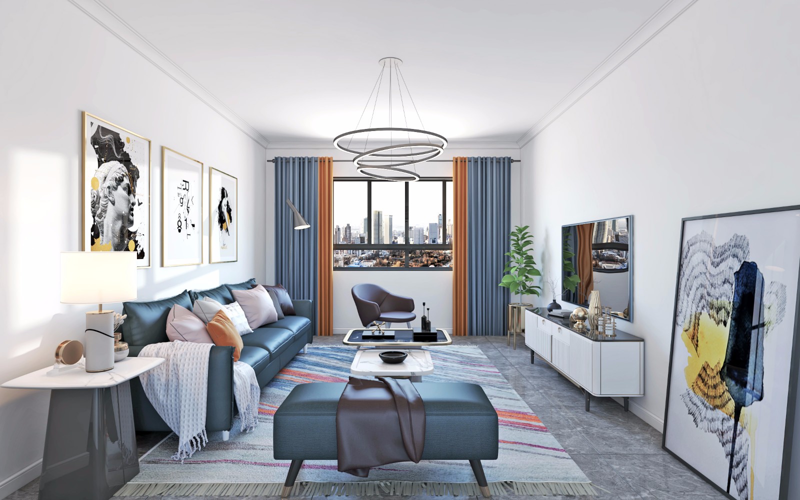 舒适清浅的客厅里,高饱和度的桔黄色与湖蓝色提亮了整个空间