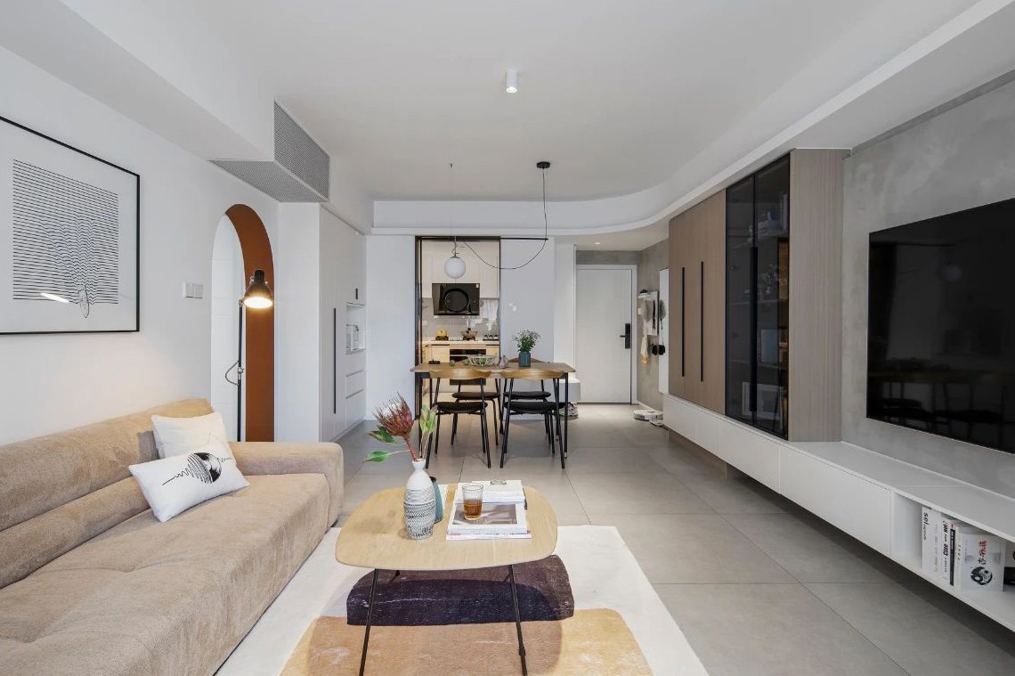 客厅天花做了弧形处理,与过道处拱形门洞相呼应。