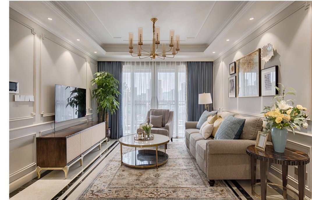 大面积的灰色空间,不是那么的冷冰冰。灰蓝色的窗帘,灰调的布艺沙发,整体色调简单。