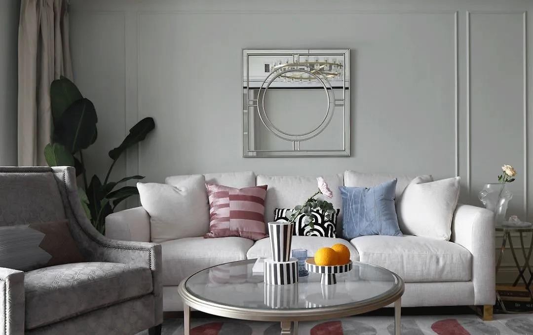 米色沙发柔软而舒适,背景墙以圆形造型镜装点,优雅素净之中,又不失活泼生趣。