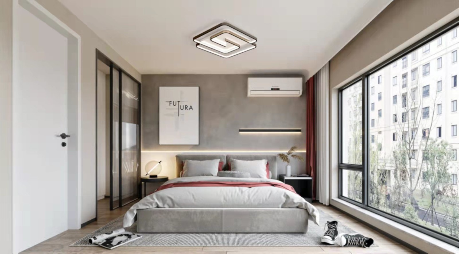 主卧材质选以木、镜面、皮织品进行搭配,营造冷暖平衡,地面铺设的暗红色地毯,让室内的每一处既有着净透的极简风,又有着令人寻味的精致理念。不规则跳动的球形吊灯,高脚边柜,通过点、线、面的结合,碰撞出全新的设计感。