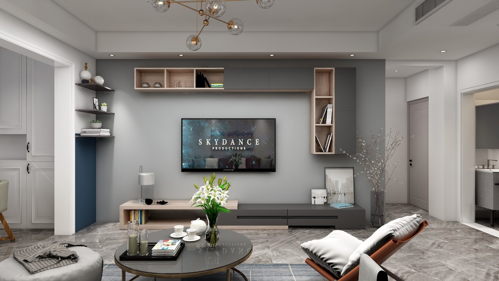 客厅电视背景墙效果,灰色调+柜子作为背景墙