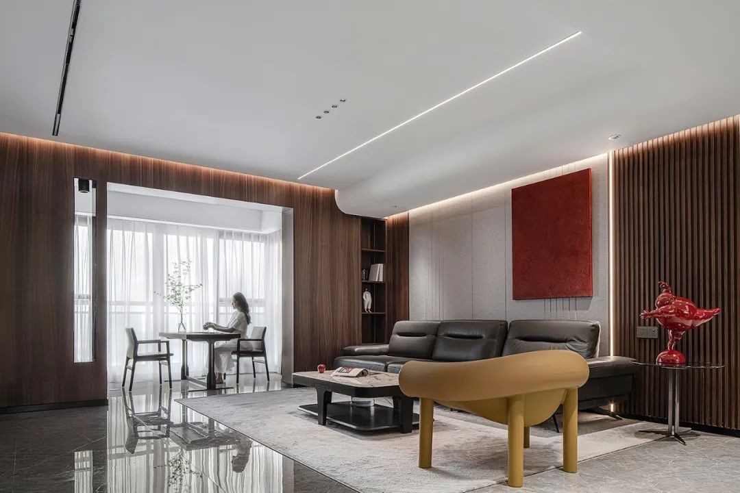在深木色主调氛围下,设计师以一抹嫣红作为点缀其中的亮色,从单椅到墙画、艺术装置,在艺术与颜色的碰撞对话中,为整体空间注入一抹灵动的气韵。