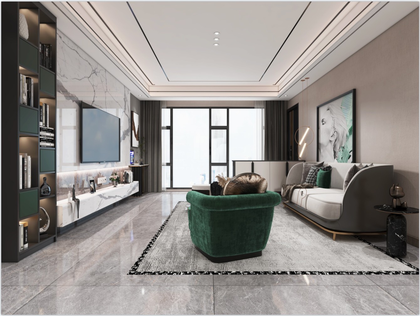 客厅,地面通铺灰色瓷砖,顶面采用点光源取代主灯,墙面环境光的设计,让灯光更有层次,大面积的木饰面和电视墙石材的运用,丰富空间质感。