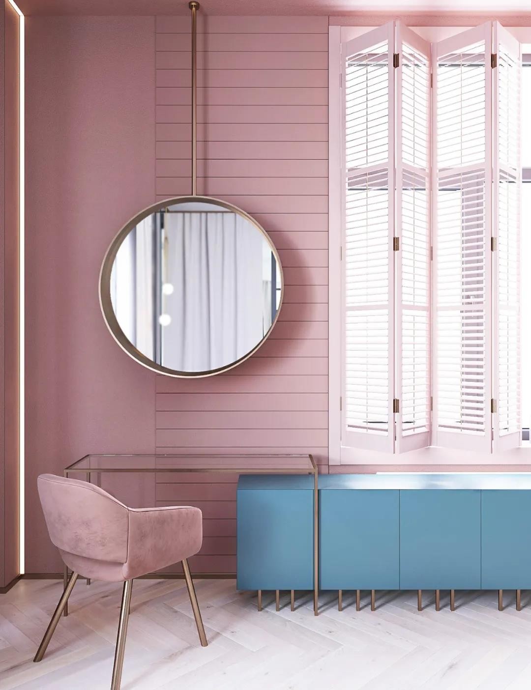 女主人的梳妆台运用极简设计,玻璃桌与矮柜充分融合,仿佛一个整体,空间协调性非常完美,大圆镜子也作为一个装饰,从远处就能照亮女主人的全身。