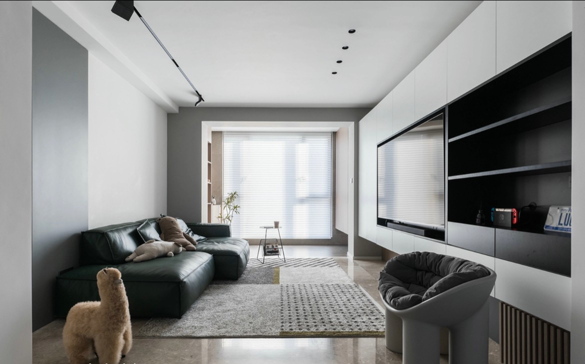 客厅的沙发背景墙选择留白和隐形门的设计,留白部分女业主想以后从展览上挑选一些中意的挂画或者艺术品,随时更换;这款绿色皮质沙发是和客户一起去家具展上挑选的,一开始业主为了能不能靠头而纠结,最终还是被颜值所折服!#客厅 #皮质 #绿色 #沙发 #电视背景墙 #电视柜 #收纳 #大象椅 #地毯 #百叶帘 #木格栅 #轨道灯 #无主灯 #现代 #简约 #精装房改造
