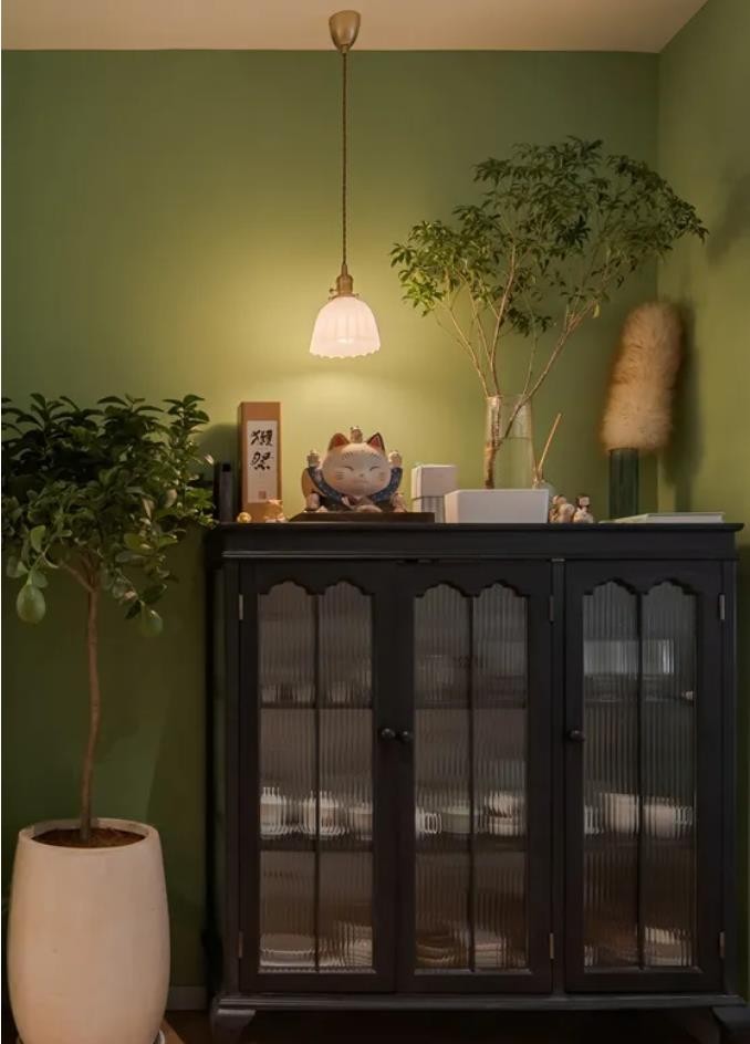 ▲ 玄关,布置黑色成品柜搭配绿色墙面,加入绿植与复古小吊灯,养眼又治愈,斗柜内放满了女主人收藏的各色茶具