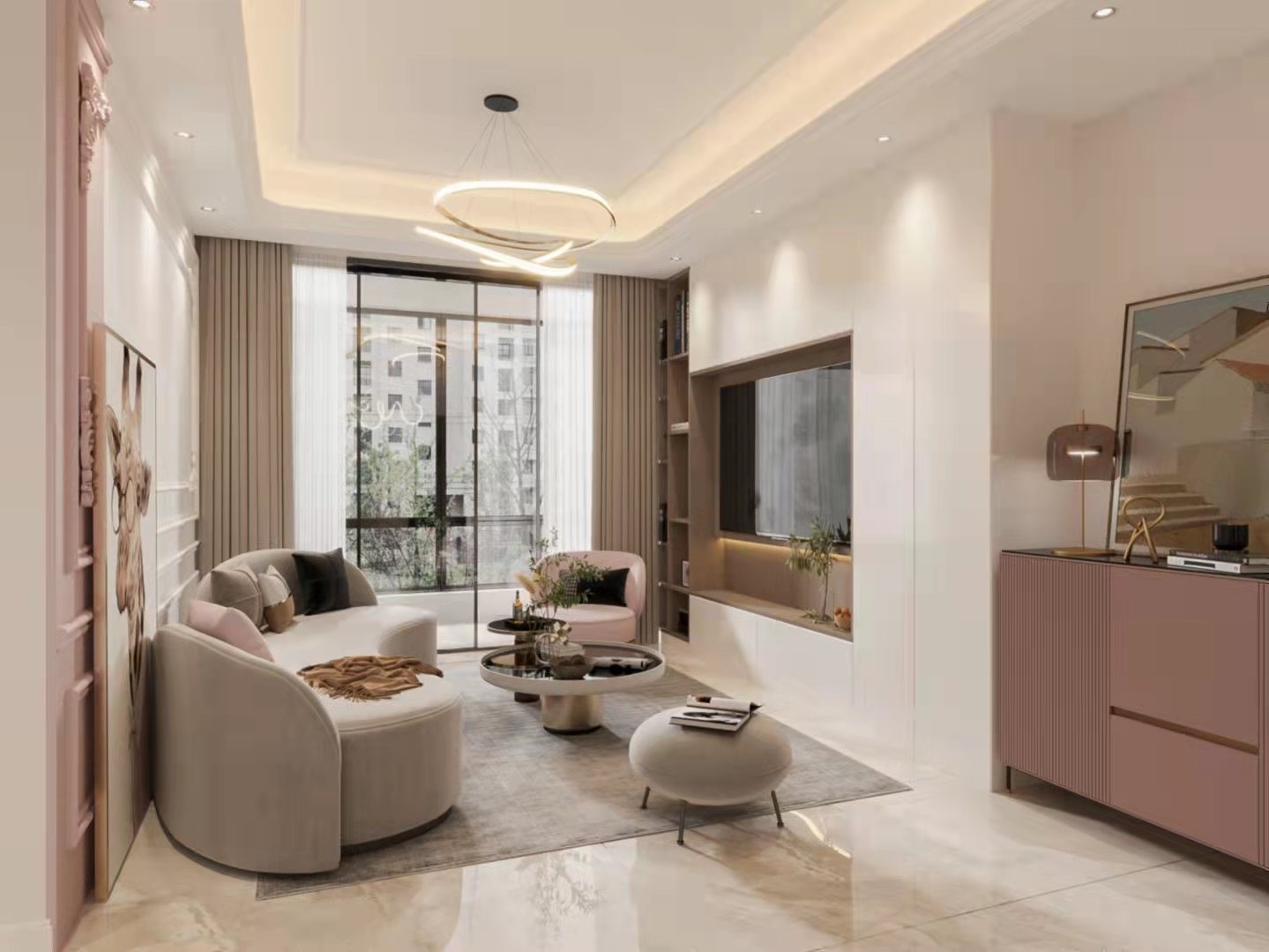 内嵌式电视机充分利用现代化工艺,粉色柜子给人以一种家的温馨感