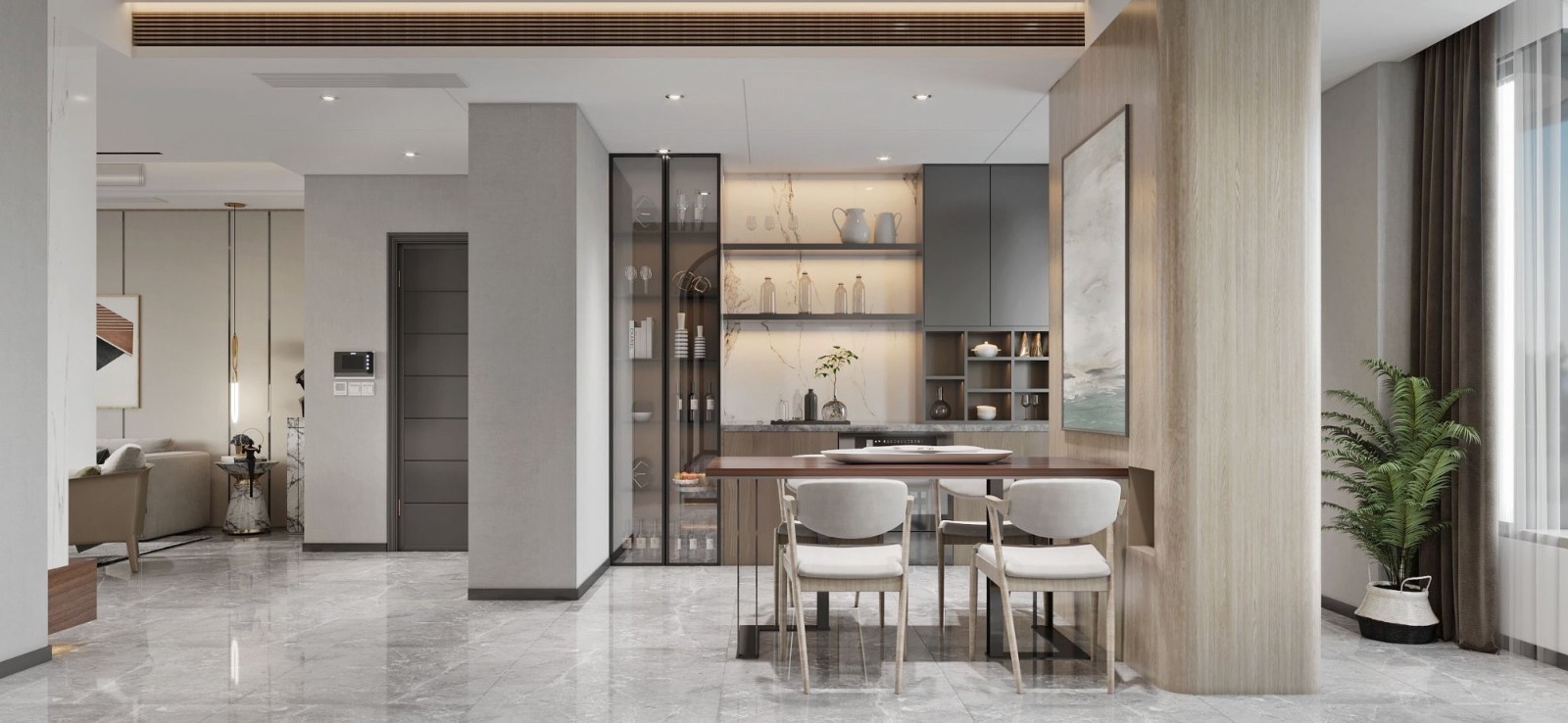 西厨空间简洁设计,以木饰面包裹柱子,在随手位置设计了壁洞,体现了以人为本的设计