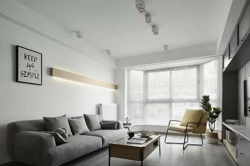 客厅空间以白色为基底,清爽而淡雅,阳光透过百叶帘洒进室内,天然的材质与简约质感的家具,让舒缓的氛围弥漫整个空间。