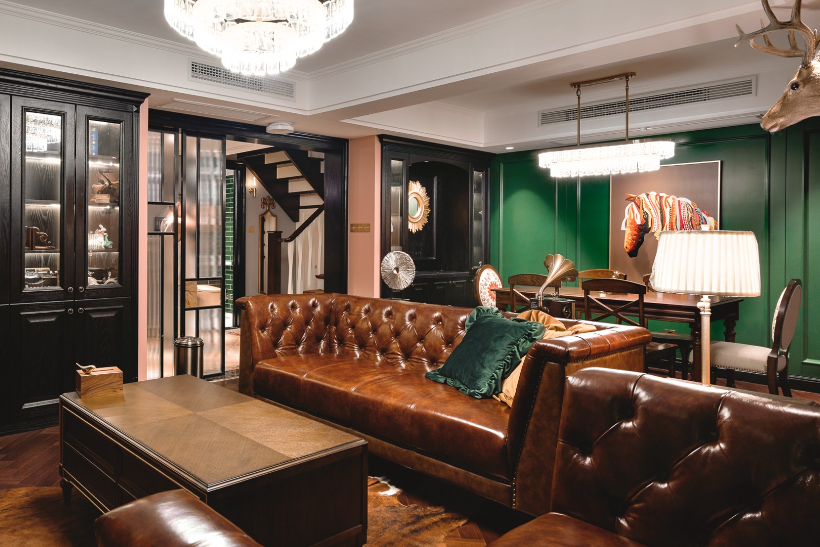 本案这个家的主人颇具艺术涵养,业余时间热爱收藏、喜欢玩音乐,对于时尚也有着独到的见解与喜好,尤其钟爱复古的色彩元素,因此也把这种偏爱运用到了自己的家中。 这个家是个两层复式,户型布局整体都不错,设计师丁趁老师几乎完全保留了原有结构,每个楼层、每个空间都进行了有效地利用。 风格上采用了美式复古风,大胆运用不同颜色、材质的碰撞,凝聚出一股戏剧张力,氤氲出豪不轻浮的奢华和耐人玩味的质感。