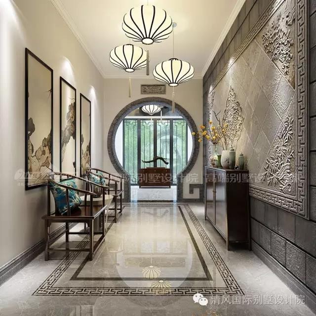 廊道,一般狭长的空间,都会增加收纳的设计,然而过多的橱柜反而会影响整体的美感,所以设计师用极简的手法,利落的处理整个空间 ,反是通过月亮门,画壁以及水墨风的画卷,将整个空间装点的极具风韵。