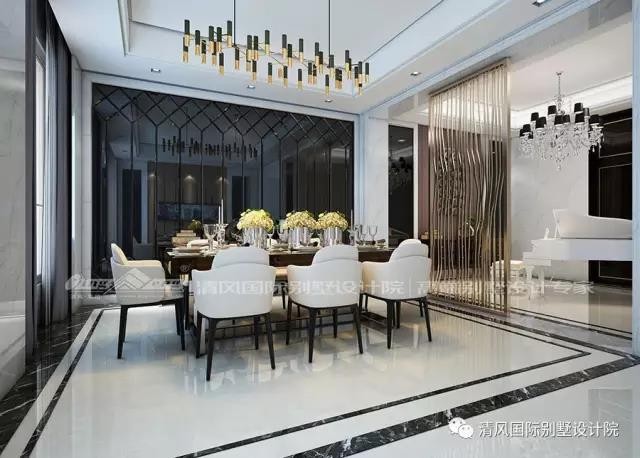 隔断的设计,一般都是用来区隔空间,但一定要在造型上花一些心思,否则厚厚的一堵墙竖在那里,真的是给生活添堵。案例中金属镂空隔断增加空间通透感,又在视觉上呈现不同功能区,配上水晶吊灯,白色钢琴,满满的都是高大上的气质。