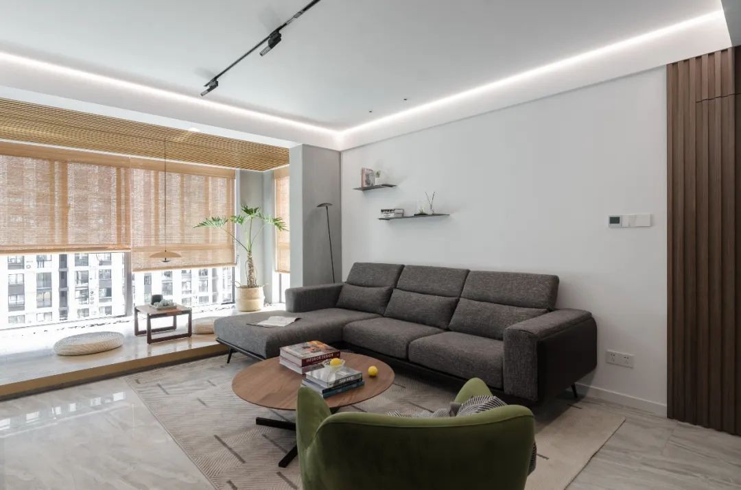 连接客厅的阳台整体做了抬高,墙面采用水泥板,天花采用条形木格栅,在材质上与客厅的功能性做出区分,也将自然光引入客厅