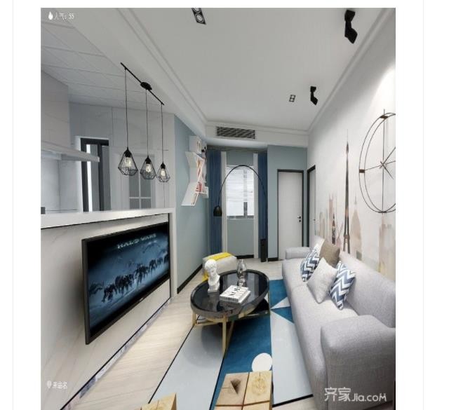 无复杂造型,电视悬挂于吧台墙上,业主年轻小两口,女主内,男主外,下班回家,沙发上面一躺,看着为自己做晚饭忙碌的妻子,幸福感爆棚!